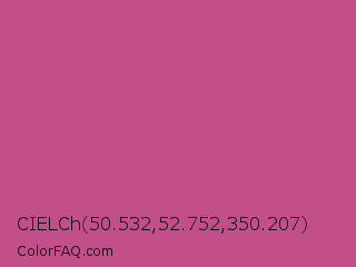 CIELCh 50.532,52.752,350.207 Color is a normal rose color and the nearest color is Mulberry #c54b8c. Hex code #c24f89 and RGB value is rgb(194,79,137). In RGB color space, this color is composed of 76% red, 31% green, 54% blue, In CMYK color space, this color is composed of 0% cyan, 59% magenta, 29% yellow , 24% black , In HSL color space, this color has a hue angle of 330° , 49% saturation and 54% lightness.