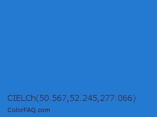 CIELCh 50.567,52.245,277.066 Color is a normal blue color and the nearest color is Bright Navy Blue #1974d2. Hex code #247ad1 and RGB value is rgb(36,122,209). In RGB color space, this color is composed of 14% red, 48% green, 82% blue, In CMYK color space, this color is composed of 83% cyan, 42% magenta, 0% yellow , 18% black , In HSL color space, this color has a hue angle of 210° , 71% saturation and 48% lightness.