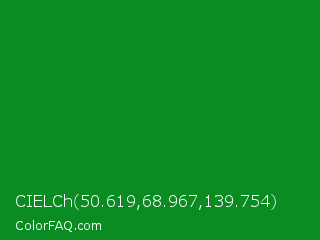 CIELCh 50.619,68.967,139.754 Color is a dark green color and the nearest color is North Texas Green #059033. Hex code #0a8c23 and RGB value is rgb(10,140,35). In RGB color space, this color is composed of 4% red, 55% green, 14% blue, In CMYK color space, this color is composed of 93% cyan, 0% magenta, 75% yellow , 45% black , In HSL color space, this color has a hue angle of 132° , 87% saturation and 29% lightness.