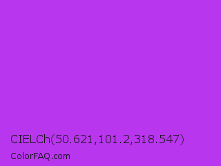 CIELCh 50.621,101.2,318.547 Color is a normal purple color and the nearest color is Veronica #a020f0. Hex code #b836ed and RGB value is rgb(184,54,237). In RGB color space, this color is composed of 72% red, 21% green, 93% blue, In CMYK color space, this color is composed of 22% cyan, 77% magenta, 0% yellow , 7% black , In HSL color space, this color has a hue angle of 283° , 84% saturation and 57% lightness.