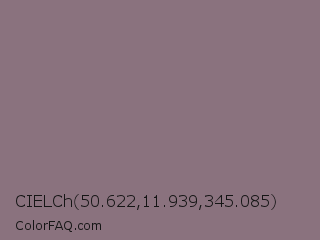 CIELCh 50.622,11.939,345.085 Color is a normal rose color and the nearest color is Hurricane #877c7b. Hex code #8a727e and RGB value is rgb(138,114,126). In RGB color space, this color is composed of 54% red, 45% green, 49% blue, In CMYK color space, this color is composed of 0% cyan, 17% magenta, 9% yellow , 46% black , In HSL color space, this color has a hue angle of 330° , 10% saturation and 49% lightness.