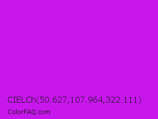 CIELCh 50.627,107.964,322.111 Color is a normal purple color and the nearest color is Vivid Mulberry #b80ce3. Hex code #c817ec and RGB value is rgb(200,23,236). In RGB color space, this color is composed of 78% red, 9% green, 93% blue, In CMYK color space, this color is composed of 15% cyan, 90% magenta, 0% yellow , 7% black , In HSL color space, this color has a hue angle of 290° , 85% saturation and 51% lightness.