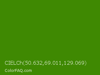 CIELCh 50.632,69.011,129.069 Color is a dark green color and the nearest color is La Palma #368716. Hex code #3f8902 and RGB value is rgb(63,137,2). In RGB color space, this color is composed of 25% red, 54% green, 1% blue, In CMYK color space, this color is composed of 54% cyan, 0% magenta, 99% yellow , 46% black , In HSL color space, this color has a hue angle of 93° , 97% saturation and 27% lightness.