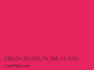 CIELCh 50.655,74.366,13.529 Color is a normal rose color and the nearest color is Razzmatazz #e3256b. Hex code #e6255f and RGB value is rgb(230,37,95). In RGB color space, this color is composed of 90% red, 15% green, 37% blue, In CMYK color space, this color is composed of 0% cyan, 84% magenta, 59% yellow , 10% black , In HSL color space, this color has a hue angle of 342° , 79% saturation and 52% lightness.