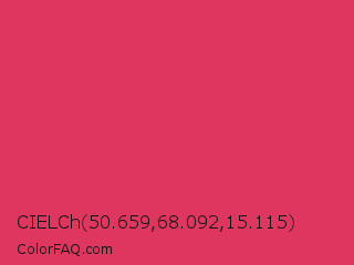 CIELCh 50.659,68.092,15.115 Color is a normal red color and the nearest color is Cerise Red #de3163. Hex code #de365e and RGB value is rgb(222,54,94). In RGB color space, this color is composed of 87% red, 21% green, 37% blue, In CMYK color space, this color is composed of 0% cyan, 76% magenta, 58% yellow , 13% black , In HSL color space, this color has a hue angle of 346° , 72% saturation and 54% lightness.