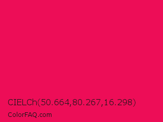 CIELCh 50.664,80.267,16.298 Color is a normal rose color and the nearest color is Razzmatazz Crayola #e30b5c. Hex code #ed0d57 and RGB value is rgb(237,13,87). In RGB color space, this color is composed of 93% red, 5% green, 34% blue, In CMYK color space, this color is composed of 0% cyan, 95% magenta, 63% yellow , 7% black , In HSL color space, this color has a hue angle of 340° , 90% saturation and 49% lightness.