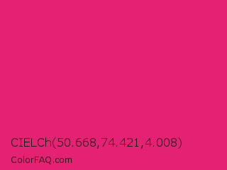 CIELCh 50.668,74.421,4.008 Color is a normal rose color and the nearest color is Razzmatazz #e3256b. Hex code #e52173 and RGB value is rgb(229,33,115). In RGB color space, this color is composed of 90% red, 13% green, 45% blue, In CMYK color space, this color is composed of 0% cyan, 86% magenta, 50% yellow , 10% black , In HSL color space, this color has a hue angle of 335° , 79% saturation and 51% lightness.