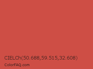 CIELCh 50.688,59.515,32.608 Color is a normal red color and the nearest color is English Vermillion #cc474b. Hex code #ce4e45 and RGB value is rgb(206,78,69). In RGB color space, this color is composed of 81% red, 31% green, 27% blue, In CMYK color space, this color is composed of 0% cyan, 62% magenta, 67% yellow , 19% black , In HSL color space, this color has a hue angle of 4° , 58% saturation and 54% lightness.