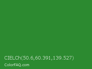 CIELCh 50.6,60.391,139.527 Color is a normal green color and the nearest color is Forest Green #228b22. Hex code #2c8a30 and RGB value is rgb(44,138,48). In RGB color space, this color is composed of 17% red, 54% green, 19% blue, In CMYK color space, this color is composed of 68% cyan, 0% magenta, 65% yellow , 46% black , In HSL color space, this color has a hue angle of 123° , 52% saturation and 36% lightness.