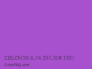 CIELCh 50.6,74.257,318.155 Color is a normal purple color and the nearest color is Medium Orchid #ba55d3. Hex code #a952ce and RGB value is rgb(169,82,206). In RGB color space, this color is composed of 66% red, 32% green, 81% blue, In CMYK color space, this color is composed of 18% cyan, 60% magenta, 0% yellow , 19% black , In HSL color space, this color has a hue angle of 282° , 56% saturation and 56% lightness.