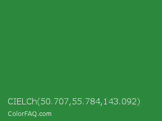 CIELCh 50.707,55.784,143.092 Color is a normal green color and the nearest color is Sea Green #2e8b57. Hex code #2b8a3c and RGB value is rgb(43,138,60). In RGB color space, this color is composed of 17% red, 54% green, 24% blue, In CMYK color space, this color is composed of 69% cyan, 0% magenta, 57% yellow , 46% black , In HSL color space, this color has a hue angle of 131° , 52% saturation and 35% lightness.
