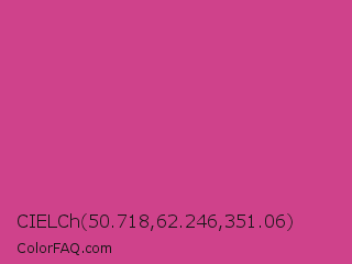CIELCh 50.718,62.246,351.06 Color is a normal rose color and the nearest color is Smitten #c84186. Hex code #cf428b and RGB value is rgb(207,66,139). In RGB color space, this color is composed of 81% red, 26% green, 55% blue, In CMYK color space, this color is composed of 0% cyan, 68% magenta, 33% yellow , 19% black , In HSL color space, this color has a hue angle of 329° , 59% saturation and 54% lightness.