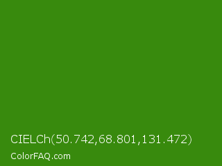 CIELCh 50.742,68.801,131.472 Color is a dark green color and the nearest color is La Palma #368716. Hex code #388a0d and RGB value is rgb(56,138,13). In RGB color space, this color is composed of 22% red, 54% green, 5% blue, In CMYK color space, this color is composed of 59% cyan, 0% magenta, 91% yellow , 46% black , In HSL color space, this color has a hue angle of 99° , 83% saturation and 30% lightness.