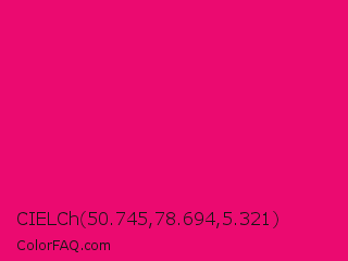 CIELCh 50.745,78.694,5.321 Color is a normal rose color and the nearest color is Red Purple #e40078. Hex code #eb0a70 and RGB value is rgb(235,10,112). In RGB color space, this color is composed of 92% red, 4% green, 44% blue, In CMYK color space, this color is composed of 0% cyan, 96% magenta, 52% yellow , 8% black , In HSL color space, this color has a hue angle of 333° , 92% saturation and 48% lightness.