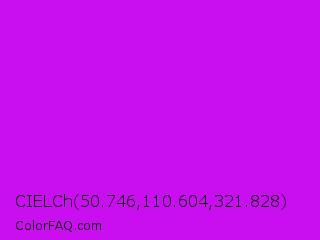 CIELCh 50.746,110.604,321.828 Color is a normal purple color and the nearest color is Vivid Orchid #cc00ff. Hex code #c90ff0 and RGB value is rgb(201,15,240). In RGB color space, this color is composed of 79% red, 6% green, 94% blue, In CMYK color space, this color is composed of 16% cyan, 94% magenta, 0% yellow , 6% black , In HSL color space, this color has a hue angle of 290° , 88% saturation and 50% lightness.
