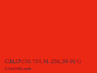 CIELCh 50.754,91.256,39.914 Color is a normal red color and the nearest color is Lust #e62020. Hex code #ea2813 and RGB value is rgb(234,40,19). In RGB color space, this color is composed of 92% red, 16% green, 7% blue, In CMYK color space, this color is composed of 0% cyan, 83% magenta, 92% yellow , 8% black , In HSL color space, this color has a hue angle of 6° , 85% saturation and 50% lightness.