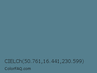 CIELCh 50.761,16.441,230.599 Color is a normal blue color and the nearest color is Smalt Blue #51808f. Hex code #557f8e and RGB value is rgb(85,127,142). In RGB color space, this color is composed of 33% red, 50% green, 56% blue, In CMYK color space, this color is composed of 40% cyan, 11% magenta, 0% yellow , 44% black , In HSL color space, this color has a hue angle of 196° , 25% saturation and 45% lightness.