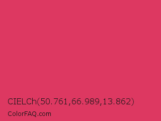 CIELCh 50.761,66.989,13.862 Color is a normal red color and the nearest color is Cerise Red #de3163. Hex code #dd3861 and RGB value is rgb(221,56,97). In RGB color space, this color is composed of 87% red, 22% green, 38% blue, In CMYK color space, this color is composed of 0% cyan, 75% magenta, 56% yellow , 13% black , In HSL color space, this color has a hue angle of 345° , 71% saturation and 54% lightness.