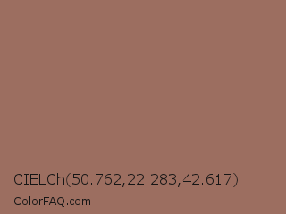 CIELCh 50.762,22.283,42.617 Color is a normal red color and the nearest color is Toast #9a6e61. Hex code #9c6e60 and RGB value is rgb(156,110,96). In RGB color space, this color is composed of 61% red, 43% green, 38% blue, In CMYK color space, this color is composed of 0% cyan, 29% magenta, 38% yellow , 39% black , In HSL color space, this color has a hue angle of 14° , 24% saturation and 49% lightness.