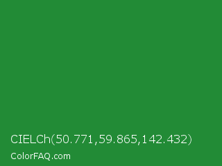 CIELCh 50.771,59.865,142.432 Color is a normal green color and the nearest color is Forest Green #228b22. Hex code #228b36 and RGB value is rgb(34,139,54). In RGB color space, this color is composed of 13% red, 55% green, 21% blue, In CMYK color space, this color is composed of 76% cyan, 0% magenta, 61% yellow , 45% black , In HSL color space, this color has a hue angle of 131° , 61% saturation and 34% lightness.