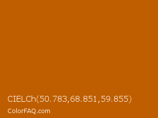 CIELCh 50.783,68.851,59.855 Color is a normal orange color and the nearest color is Rose Of Sharon #bf5500. Hex code #bf5e00 and RGB value is rgb(191,94,0). In RGB color space, this color is composed of 75% red, 37% green, 0% blue, In CMYK color space, this color is composed of 0% cyan, 51% magenta, 100% yellow , 25% black , In HSL color space, this color has a hue angle of 30° , 100% saturation and 37% lightness.