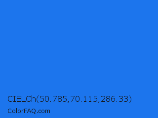 CIELCh 50.785,70.115,286.33 Color is a normal blue color and the nearest color is Blue Crayola #1f75fe. Hex code #1c75ed and RGB value is rgb(28,117,237). In RGB color space, this color is composed of 11% red, 46% green, 93% blue, In CMYK color space, this color is composed of 88% cyan, 51% magenta, 0% yellow , 7% black , In HSL color space, this color has a hue angle of 214° , 85% saturation and 52% lightness.