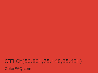CIELCh 50.801,75.148,35.431 Color is a normal red color and the nearest color is CG Red #e03c31. Hex code #de3d32 and RGB value is rgb(222,61,50). In RGB color space, this color is composed of 87% red, 24% green, 20% blue, In CMYK color space, this color is composed of 0% cyan, 73% magenta, 77% yellow , 13% black , In HSL color space, this color has a hue angle of 4° , 72% saturation and 53% lightness.