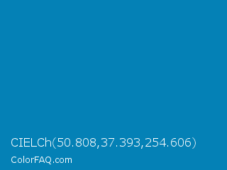 CIELCh 50.808,37.393,254.606 Color is a normal blue color and the nearest color is Star Command Blue #007bb8. Hex code #0481b6 and RGB value is rgb(4,129,182). In RGB color space, this color is composed of 2% red, 51% green, 71% blue, In CMYK color space, this color is composed of 98% cyan, 29% magenta, 0% yellow , 29% black , In HSL color space, this color has a hue angle of 198° , 96% saturation and 36% lightness.