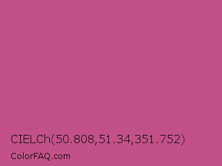 CIELCh 50.808,51.34,351.752 Color is a normal rose color and the nearest color is Mulberry #c54b8c. Hex code #c25187 and RGB value is rgb(194,81,135). In RGB color space, this color is composed of 76% red, 32% green, 53% blue, In CMYK color space, this color is composed of 0% cyan, 58% magenta, 30% yellow , 24% black , In HSL color space, this color has a hue angle of 331° , 48% saturation and 54% lightness.