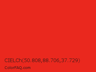 CIELCh 50.808,88.706,37.729 Color is a normal red color and the nearest color is Lust #e62020. Hex code #ea281e and RGB value is rgb(234,40,30). In RGB color space, this color is composed of 92% red, 16% green, 12% blue, In CMYK color space, this color is composed of 0% cyan, 83% magenta, 87% yellow , 8% black , In HSL color space, this color has a hue angle of 3° , 83% saturation and 52% lightness.