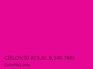 CIELCh 50.819,81.8,349.788 Color is a normal magenta color and the nearest color is Hollywood Cerise #f400a1. Hex code #e60794 and RGB value is rgb(230,7,148). In RGB color space, this color is composed of 90% red, 3% green, 58% blue, In CMYK color space, this color is composed of 0% cyan, 97% magenta, 36% yellow , 10% black , In HSL color space, this color has a hue angle of 322° , 94% saturation and 46% lightness.