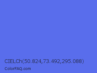 CIELCh 50.824,73.492,295.088 Color is a light blue color and the nearest color is Very Light Blue #6666ff. Hex code #596dec and RGB value is rgb(89,109,236). In RGB color space, this color is composed of 35% red, 43% green, 93% blue, In CMYK color space, this color is composed of 62% cyan, 54% magenta, 0% yellow , 7% black , In HSL color space, this color has a hue angle of 232° , 79% saturation and 64% lightness.