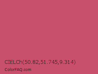 CIELCh 50.82,51.745,9.314 Color is a normal red color and the nearest color is Ruber #ce4676. Hex code #c94f6d and RGB value is rgb(201,79,109). In RGB color space, this color is composed of 79% red, 31% green, 43% blue, In CMYK color space, this color is composed of 0% cyan, 61% magenta, 46% yellow , 21% black , In HSL color space, this color has a hue angle of 345° , 53% saturation and 55% lightness.