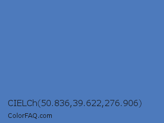 CIELCh 50.836,39.622,276.906 Color is a normal blue color and the nearest color is Cyan Blue Azure #4682bf. Hex code #4d7abc and RGB value is rgb(77,122,188). In RGB color space, this color is composed of 30% red, 48% green, 74% blue, In CMYK color space, this color is composed of 59% cyan, 35% magenta, 0% yellow , 26% black , In HSL color space, this color has a hue angle of 216° , 45% saturation and 52% lightness.