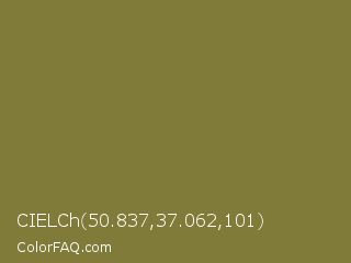 CIELCh 50.837,37.062,101 Color is a normal yellow color and the nearest color is Old Moss Green #867e36. Hex code #817b39 and RGB value is rgb(129,123,57). In RGB color space, this color is composed of 51% red, 48% green, 22% blue, In CMYK color space, this color is composed of 0% cyan, 5% magenta, 56% yellow , 49% black , In HSL color space, this color has a hue angle of 55° , 39% saturation and 36% lightness.