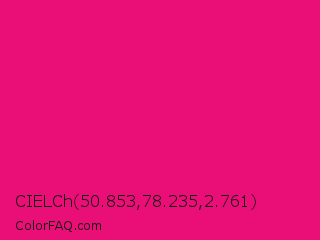 CIELCh 50.853,78.235,2.761 Color is a normal rose color and the nearest color is Red Purple #e40078. Hex code #ea0f76 and RGB value is rgb(234,15,118). In RGB color space, this color is composed of 92% red, 6% green, 46% blue, In CMYK color space, this color is composed of 0% cyan, 94% magenta, 50% yellow , 8% black , In HSL color space, this color has a hue angle of 332° , 88% saturation and 49% lightness.