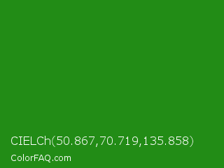 CIELCh 50.867,70.719,135.858 Color is a normal green color and the nearest color is Forest Green #228b22. Hex code #228c16 and RGB value is rgb(34,140,22). In RGB color space, this color is composed of 13% red, 55% green, 9% blue, In CMYK color space, this color is composed of 76% cyan, 0% magenta, 84% yellow , 45% black , In HSL color space, this color has a hue angle of 114° , 73% saturation and 32% lightness.