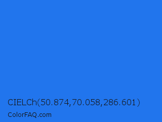 CIELCh 50.874,70.058,286.601 Color is a normal blue color and the nearest color is Blue Crayola #1f75fe. Hex code #2175ed and RGB value is rgb(33,117,237). In RGB color space, this color is composed of 13% red, 46% green, 93% blue, In CMYK color space, this color is composed of 86% cyan, 51% magenta, 0% yellow , 7% black , In HSL color space, this color has a hue angle of 215° , 85% saturation and 53% lightness.