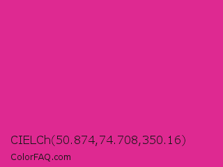 CIELCh 50.874,74.708,350.16 Color is a normal magenta color and the nearest color is Barbie Pink #e0218a. Hex code #de2991 and RGB value is rgb(222,41,145). In RGB color space, this color is composed of 87% red, 16% green, 57% blue, In CMYK color space, this color is composed of 0% cyan, 82% magenta, 35% yellow , 13% black , In HSL color space, this color has a hue angle of 326° , 73% saturation and 52% lightness.
