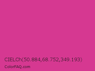 CIELCh 50.884,68.752,349.193 Color is a normal magenta color and the nearest color is Cerise #da3287. Hex code #d63891 and RGB value is rgb(214,56,145). In RGB color space, this color is composed of 84% red, 22% green, 57% blue, In CMYK color space, this color is composed of 0% cyan, 74% magenta, 32% yellow , 16% black , In HSL color space, this color has a hue angle of 326° , 66% saturation and 53% lightness.