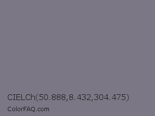 CIELCh 50.888,8.432,304.475 Color is a normal violet color and the nearest color is Topaz #7c778a. Hex code #7c7785 and RGB value is rgb(124,119,133). In RGB color space, this color is composed of 49% red, 47% green, 52% blue, In CMYK color space, this color is composed of 7% cyan, 11% magenta, 0% yellow , 48% black , In HSL color space, this color has a hue angle of 261° , 6% saturation and 49% lightness.