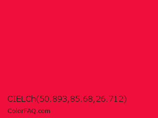 CIELCh 50.893,85.68,26.712 Color is a normal red color and the nearest color is Red Ribbon #ed0a3f. Hex code #f00e3d and RGB value is rgb(240,14,61). In RGB color space, this color is composed of 94% red, 5% green, 24% blue, In CMYK color space, this color is composed of 0% cyan, 94% magenta, 75% yellow , 6% black , In HSL color space, this color has a hue angle of 348° , 89% saturation and 50% lightness.