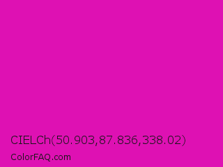 CIELCh 50.903,87.836,338.02 Color is a normal magenta color and the nearest color is Shocking Pink #fc0fc0. Hex code #de11b3 and RGB value is rgb(222,17,179). In RGB color space, this color is composed of 87% red, 7% green, 70% blue, In CMYK color space, this color is composed of 0% cyan, 92% magenta, 19% yellow , 13% black , In HSL color space, this color has a hue angle of 313° , 86% saturation and 47% lightness.