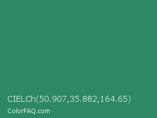CIELCh 50.907,35.882,164.65 Color is a normal green color and the nearest color is Eucalyptus #278a5b. Hex code #2e8868 and RGB value is rgb(46,136,104). In RGB color space, this color is composed of 18% red, 53% green, 41% blue, In CMYK color space, this color is composed of 66% cyan, 0% magenta, 24% yellow , 47% black , In HSL color space, this color has a hue angle of 159° , 49% saturation and 36% lightness.