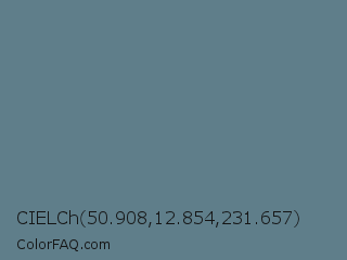 CIELCh 50.908,12.854,231.657 Color is a normal blue color and the nearest color is Steel Teal #5f8a8b. Hex code #5f7e8a and RGB value is rgb(95,126,138). In RGB color space, this color is composed of 37% red, 49% green, 54% blue, In CMYK color space, this color is composed of 31% cyan, 9% magenta, 0% yellow , 46% black , In HSL color space, this color has a hue angle of 197° , 18% saturation and 46% lightness.