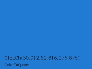 CIELCh 50.912,52.816,276.876 Color is a normal blue color and the nearest color is Bright Navy Blue #1974d2. Hex code #217bd3 and RGB value is rgb(33,123,211). In RGB color space, this color is composed of 13% red, 48% green, 83% blue, In CMYK color space, this color is composed of 84% cyan, 42% magenta, 0% yellow , 17% black , In HSL color space, this color has a hue angle of 210° , 73% saturation and 48% lightness.