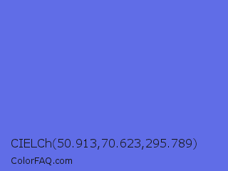 CIELCh 50.913,70.623,295.789 Color is a light blue color and the nearest color is Very Light Blue #6666ff. Hex code #606de7 and RGB value is rgb(96,109,231). In RGB color space, this color is composed of 38% red, 43% green, 91% blue, In CMYK color space, this color is composed of 58% cyan, 53% magenta, 0% yellow , 9% black , In HSL color space, this color has a hue angle of 234° , 74% saturation and 64% lightness.
