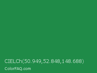CIELCh 50.949,52.848,148.688 Color is a normal green color and the nearest color is Eucalyptus #278a5b. Hex code #1f8b48 and RGB value is rgb(31,139,72). In RGB color space, this color is composed of 12% red, 55% green, 28% blue, In CMYK color space, this color is composed of 78% cyan, 0% magenta, 48% yellow , 45% black , In HSL color space, this color has a hue angle of 143° , 64% saturation and 33% lightness.