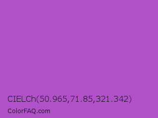 CIELCh 50.965,71.85,321.342 Color is a normal purple color and the nearest color is Medium Orchid #ba55d3. Hex code #b051c7 and RGB value is rgb(176,81,199). In RGB color space, this color is composed of 69% red, 32% green, 78% blue, In CMYK color space, this color is composed of 12% cyan, 59% magenta, 0% yellow , 22% black , In HSL color space, this color has a hue angle of 288° , 51% saturation and 55% lightness.