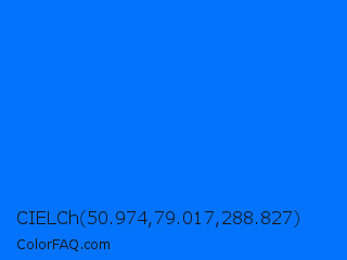 CIELCh 50.974,79.017,288.827 Color is a normal blue color and the nearest color is Brandeis Blue #0070ff. Hex code #0373fb and RGB value is rgb(3,115,251). In RGB color space, this color is composed of 1% red, 45% green, 98% blue, In CMYK color space, this color is composed of 99% cyan, 54% magenta, 0% yellow , 2% black , In HSL color space, this color has a hue angle of 213° , 98% saturation and 50% lightness.